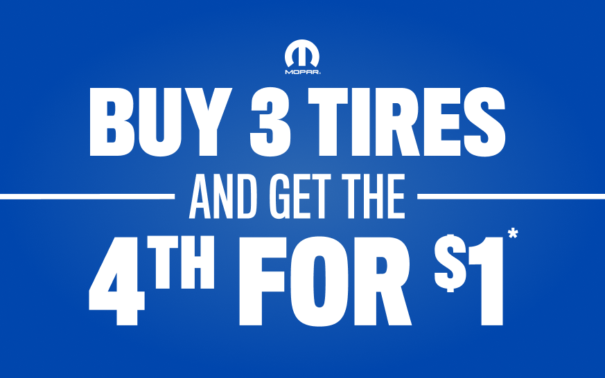 Offer valid 3/01/2025 – 4/30/2025. Available on select tires in stock at participating dealerships. Kelly and Laufenn are excluded. Toyo medium truck, Mickey Thompson specialty, truck, street & drag tires are excluded. Not compatible with the Tire Price Match Guarantee. See your Service Advisor for details on separate MICHELIN®, UNIROYAL® and BFGOODRICH® promotional offer. ©2025 FCA US LLC. All Rights Reserved. Chrysler, Dodge, Jeep, Ram, Mopar, SRT and HEMI are registered trademarks of FCA US LLC. ALFA ROMEO and FIAT are registered trademarks of FCA Group Marketing S.p.A., used with permission. OFFER EXPIRES 04/30/2025 68886-001AOL0-h3-t2bc--us-en